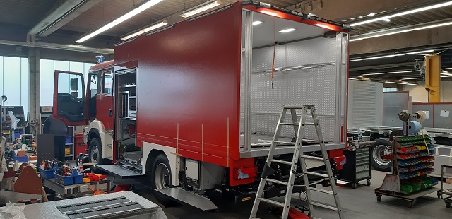 Im Produktionsstandort der Albert Ziegler Feuerschutz GmbH in Rendsburg im Kreis Rendsburg-Eckernförde konnte nun der aktuelle Stand der Arbeiten mit dem Hersteller im Detail abgestimmt werden. Der Aufbau wurde individuell für das Feuerwehrfahrzeug angefertigt und auf die Belange der Arnsberger Feuerwehr abgestimmt.
