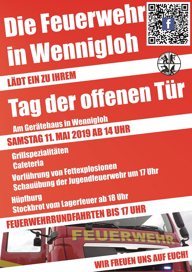 Am Samstag, den 11. Mai veranstaltet die Löschgruppe Wennigloh wieder ihren Tag der offenen Tür, zu dem sie alle Interessierten sehr herzlich einlädt. Neben verschiedenen Aktionen rund um die Feuerwehr wird natürlich auch für das leibliche Wohl bestens gesorgt sein. So ist der Tag der offenen Tür der Wennigloher Wehrleute eine tolle Gelegenheit für einen interessanten Ausflug mit der ganzen Familie.
