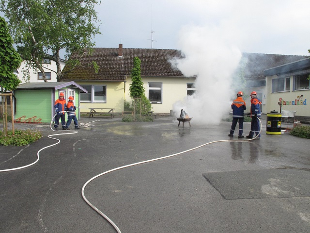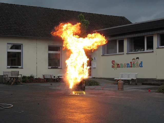 Zudem demonstrierten die Wennigloher Wehrleute ihren Gästen anhand einer speziellen Vorrichtung sehr anschaulich, was passiert, wenn versucht wird, einen Fettbrand mit Wasser zu löschen. Die dadurch entstehende meterhohe Stichflamme kann in der Küche verheerende Folgen für Personen haben, die von ihr erfasst werden und kann überdies einen Küchen- oder gar einen Wohnungsbrand auslösen. Außerdem führte die Wennigloher Jugendfeuerwehrgruppe am Nachmittag eine Schauübung auf dem Kindergartenplatz vor