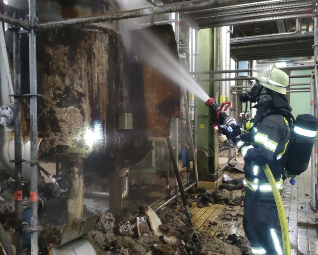 Vor Ort rückten sowohl die städtische Feuerwehr als auch die Betriebsfeuerwehr des Unternehmens aus. Insgesamt waren rund 70 Einsatzkräfte beteiligt, darunter vier Atemschutztrupps, die mit C-Rohren gegen die Flammen vorgingen. Die Isolierung des betroffenen Behälters wurde entfernt und gezielt abgelöscht, um eine Ausbreitung des Feuers auf angrenzende Produktionsbereiche zu verhindern.