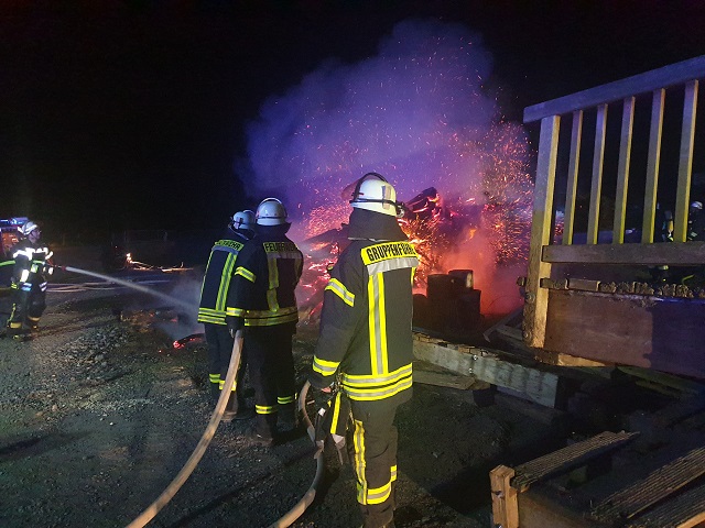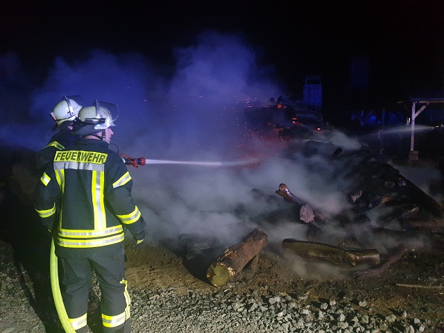 Am Samstagabend um 21 Uhr wurden die Kräfte der Feuerwehr zu einem vermutlichen Scheunenbrand in die Wicheler Straße in Hüsten gerufen. Nach der ersten Erkundung der Einsatzkräfte auf dem Landwirtschaftlichen Hof, konnte schnell Entwarnung gegeben werden. Ein großer Holzstapel war in Brand geraten und musste durch die eingesetzten Kräfte mit mehreren Strahlrohren abgelöscht werden. Der Eigentümer unterstütze mit einem Radlader, dass Holz auseinander zu ziehen, um die betroffenen Bereiche abzulöschen. Die Nachlöscharbeiten dauerten bis in den späten Abend an.