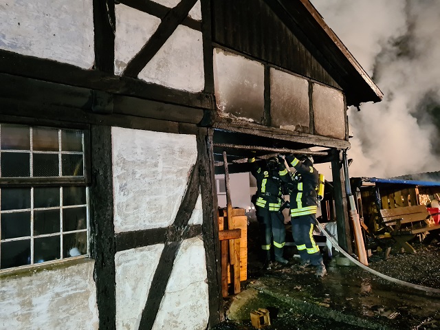 Die Fassade der Scheune konnte schnell gelöscht werden, eine Ausbreitung in das Gebäude wurde verhindert. Die Bekämpfung des Brandes in dem aufgeschichteten Brennholz gestaltete sich schwieriger. Als die meisten Flammen gelöscht waren, wurde das Holz auf dem Gelände ausgebreitet und kleinste Glutnester abgelöscht. Insgesamt waren 6 Trupps unter schwerem Atemschutz abwechselnd mit der Brandbekämpfung beschäftigt.