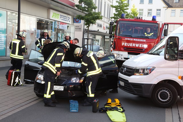 Beim Zusammenstoß zweier Fahrzeuge ist am Donnerstagmorgen eine junge Frau verletzt worden, sie wurde vor Ort vom Rettungsdienst behandelt und ins Krankenhaus gebracht. Der Unfall ereignete sich gegen 10 Uhr auf der Clemens-August-Straße gegenüber dem Haupteingang Brückencenter. Erste Meldungen, dass die Frau eingeklemmt sei, bestätigten sich nicht. Um die Rettung möglichst schonend durchzuführen und da eine Wirbelsäulenverletzung nicht auszuschließen war, setzte die Feuerwehr ein so genanntes „Spineboard“ ein und befreite die Verletzte aus dem Fahrzeug. Die Wehrleute sicherten den Brandschutz an der Einsatzstelle und klemmten die Batterie des Unfallautos ab. Die Clemens-August-Straße war während des Einsatzes von der Polizei gesperrt.