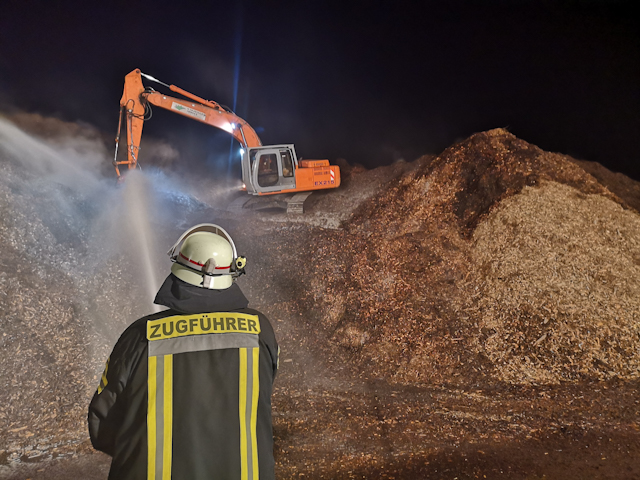 Beim Eintreffen der ersten Kräfte stellte sich heraus, dass aus einem Teilbereich der gelagerten Holzhackschnitzel Rauchwolken zu sehen waren. Im Innern des Hackschnitzellagers wurde eine erhöhte Temperatur festgestellt. Die vorgefundene Lagerstätte hat ein geschätztes Volumen von rund 28.000 Kubikmetern, mit den ungefähren flächenmäßigen Ausmaßen von rund 75 x 50 x 10 m.