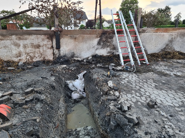 Nachdem das Feuer größtenteils niedergebrannt war, sollten die Reste gelöscht werden. Hierzu wurde der Ablaufkanal der Scheune mithilfe eines zufällig vorhandenen Baggers freigelegt.Um zu verhindern, dass Löschwasser und Löschschaum in die Kanalisation gelangen wurde der Kanal mit pneumatischen Dichtkissen abgedichtet.