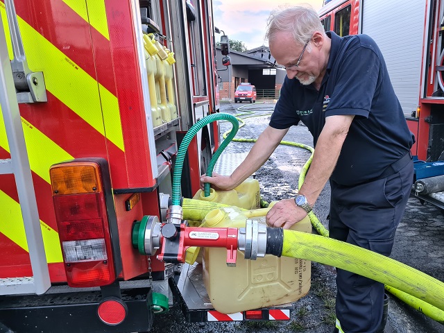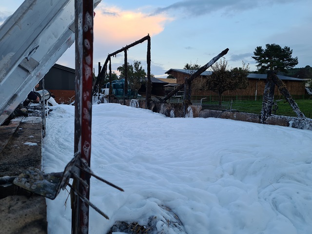 Das restliche Brandgut wurde nun mit Wasser gelöscht, zum Schutz vor einer erneuten Entzündung und zum Ersticken der letzten Glutnester wurde das gesamte Brandgut mit einem Teppich aus Löschschaum überzogen.