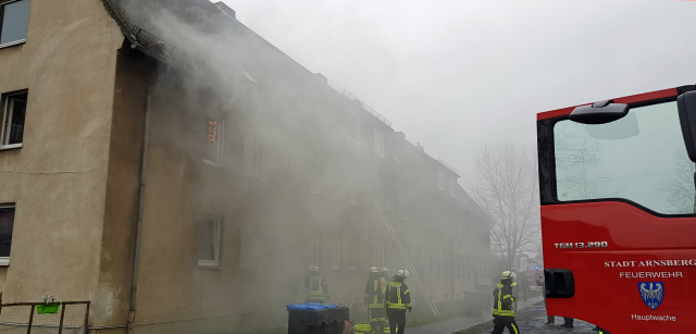 Arnsberg. Zum zweiten Einsatz am Freitag wurde die Feuerwehr Arnsberg und der Rettungsdienst um 11.09 Uhr alarmiert; diesmal zu einem ausgedehnten Kellerbrand in einem Mehrfamilienhaus auf der Hammerweide in Arnsberg. Da zu diesem Zeitpunkt nicht klar war ob sich noch Bewohner im Gebäude befinden, wurde mit den Wachen 1 und 2, den Löschzügen Arnsberg und Bruchhausen, den Löschgruppen Niedereimer und Wennigloh sowie mit dem Fernmeldedienst ein Großaufgebot an Einsatzkräften alarmiert. Beim Eintreffen der Wache 2 drang dichter Rauch aus den Fenstern und der Eingangstür. Sofort wurde ein Löschangriff von der vorderen und hinteren Seite des Gebäudes vorgenommen. Von insgesamt 12 Bewohnern hatten sich bereits sieben Personen ins Freie retten können, fünf Bewohner wurden von den Feuerwehrleuten über eine Steckleiter und mit dem Korb der Drehleiter durch die Fenster des Gebäudes evakuiert. Da bei allen Geretteten nach Untersuchung durch den Notarzt der Verdacht einer Rauchgasintoxikation bestand, wurde das Alarmstichwort auf „Rettung 3“ erhöht, das heißt, zusätzliche Fahrzeuge des Rettungsdienstes wurden von der Leitstelle des Hochsauerlandkreises in Richtung Hammerweide beordert. Drei Bewohner wurden zur Weiterbehandlung in umliegende Krankenhäuser gebracht, die verbliebenden neun Personen kamen bei Nachbarn unter. Nachdem das Feuer gelöscht und das Gebäude mit einem Hochleistungslüfter gelüftet war, war der Einsatz für die ca. 85 Einsatzkräfte gegen 13 Uhr beendet.