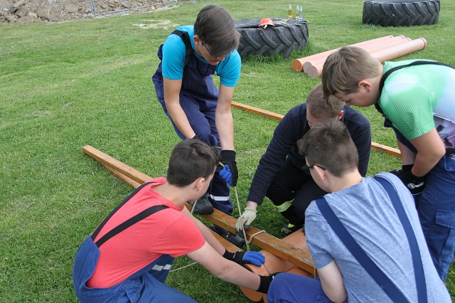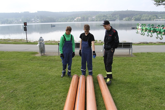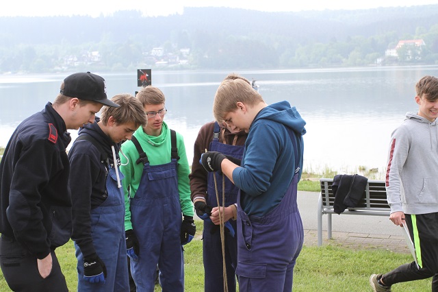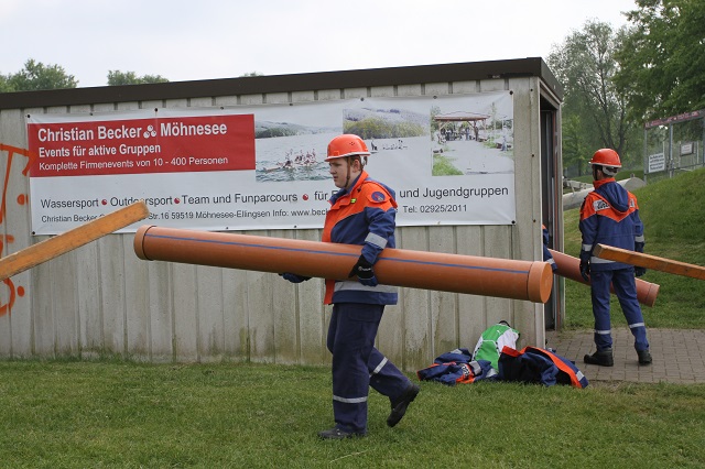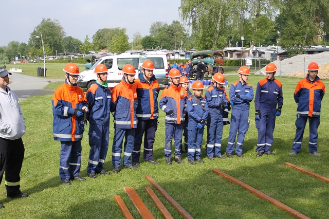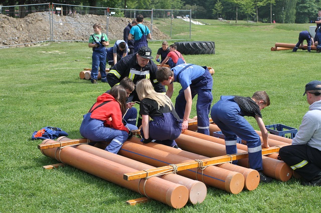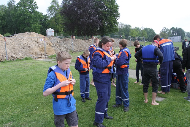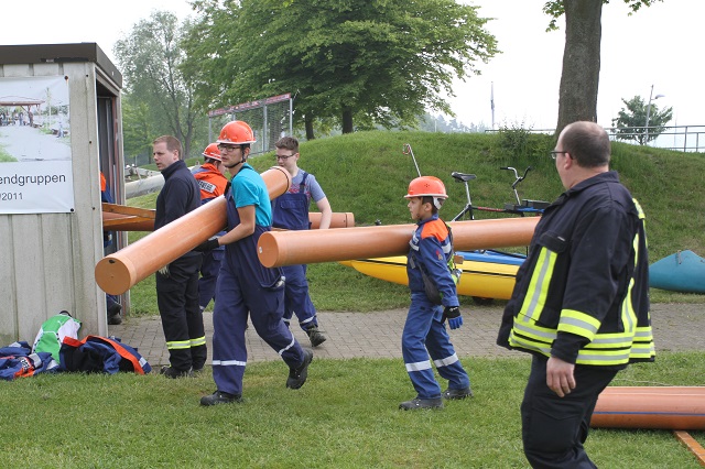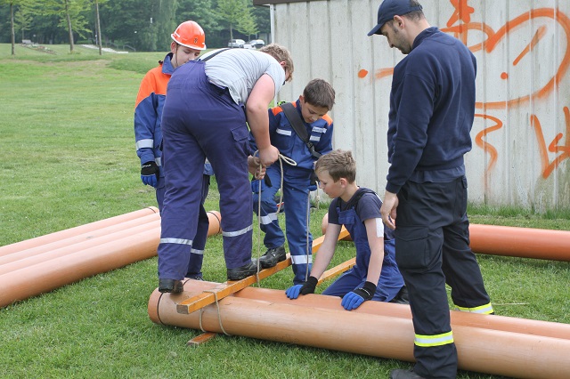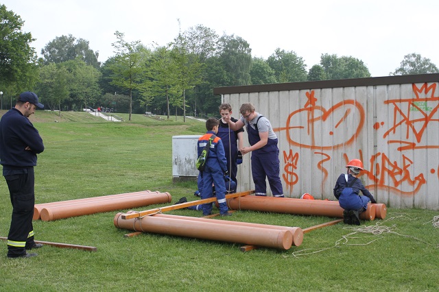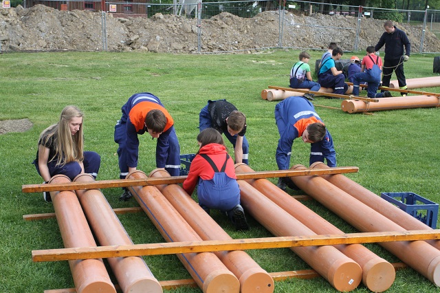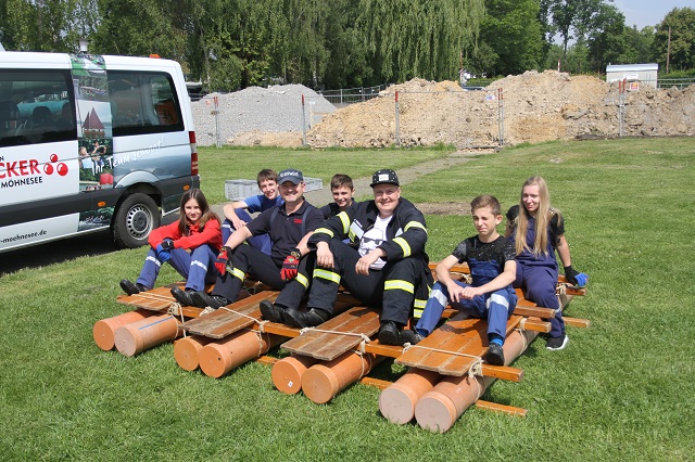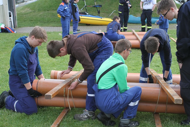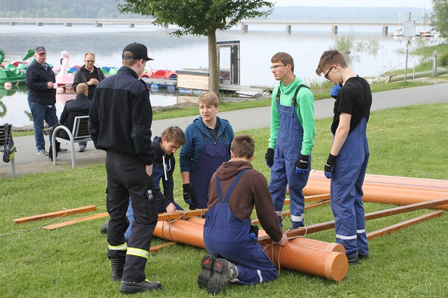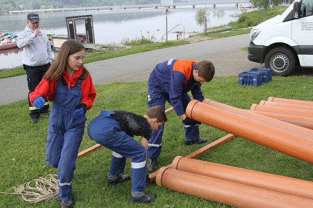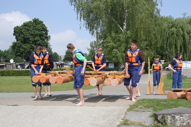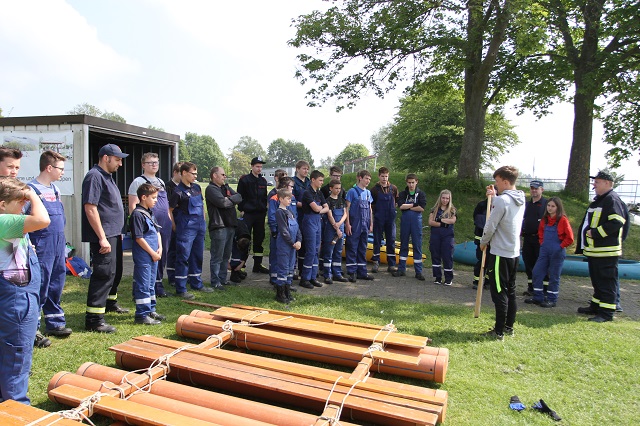 Die Floßbauer hatten es nicht so leicht wie die Kanufahrer, denn sie mussten ihren schwimmenden Untersatz erst bauen, bevor es ins kühle Nass ging. Teamleiter Fabio erklärte zunächst die Technik, die angewendet werden müsse. Er erklärte, wie die Schwimmträger der Flöße mit Seilen verbunden werden (mit Knoten kennt sich die Jugendfeuerwehr ja bestens aus) und wie die Teams der Jugendlichen ihre Größe des Floßes bestimmen können. Dafür musste wegen der Tragfähigkeit der Flöße das jeweilige Gesamtgewicht der Gruppen ausgerechnet werden. Anschließend wurden Baumaterialien gesucht und untereinander verknotet. Teamleiter Fabio beobachtete die Gruppen bei dieser Aufgabe und verteilte auch entsprechend Punkte. Während des Zusammenbaus der Flöße wurden diese von den Jugendlichen schon mal mit phantasievollen Namen wie MS Rapunzel, Titanic, Fireboat, LSP und Seepferdchen getauft.