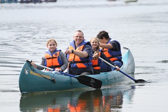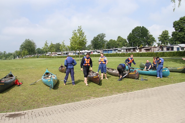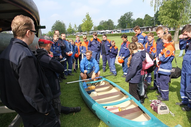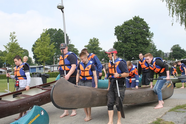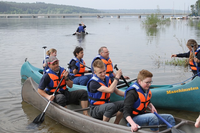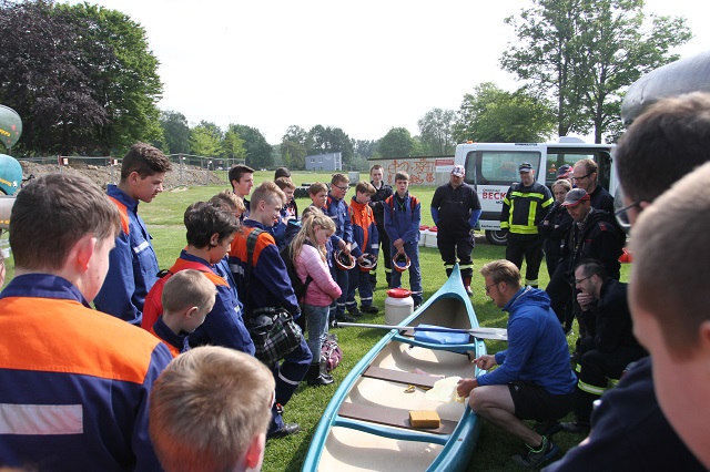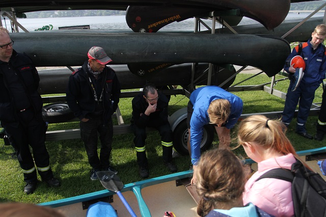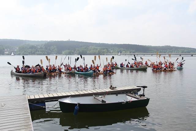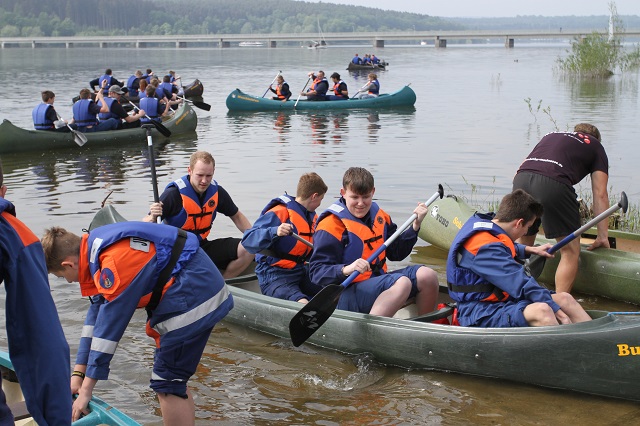 Dort angekommen, wurden die Jugendlichen von den Teamleitern Dennis und Fabio von der Eventagentur „Christian Becker Möhnesee GmbH“ in Empfang genommen. Man konnte wählen, ein Floß zu bauen oder auf dem Kanu den Möhnesee zu erkunden. Entsprechend den Wünschen wurden die Teams aufgestellt und es ging gleich los. Die Kanuten bekamen von Kanuführer Dennis zuerst eine Sicherheitsunterweisung. Danach wurden sieben Kanus vom Anhänger entladen, die Schwimmwesten, übrigens farblich passend zur Jugendfeuerwehruniform, Paddel und sonstiges Zubehör organisiert, bevor es kurz danach direkt ins 11 Grad kalte Wasser ging. Als alle Kanus mit jeweils drei Jugendfeuerwehrangehörigen und einem Ausbilder besetzt waren, wurden kräftig die Paddel geschwungen. Nach anfänglichen Startschwierigkeiten hatte jedes Team seinen persönlichen Takt gefunden und die ersten Zwischenziele (Bojen) wurden gemeinsam angesteuert. Mitten auf dem Möhnesee bekamen die Jungkanuten von Bootsführer Dennis dann die Aufgabe, alle Boote zu einem „großen“ Kanu aneinanderzureihen und dann als eine große Einheit weiter paddeln. Diese Aufgabe meisterten die Jugendlichen recht schnell und es wurde ein Teilstück auf der Möhne gemeinsam zurückgelegt. Nach über zwei Stunden auf See, natürlich gab es zwischendurch auch eine Pause, ging es mit müden Armen zurück zum Anleger.