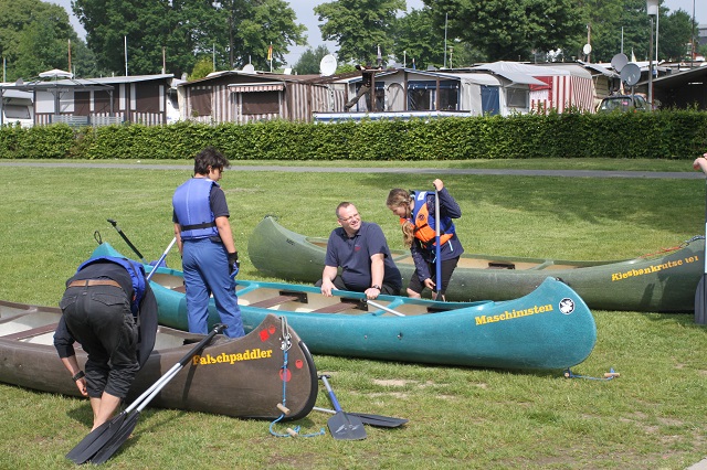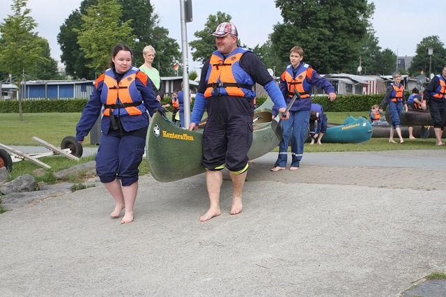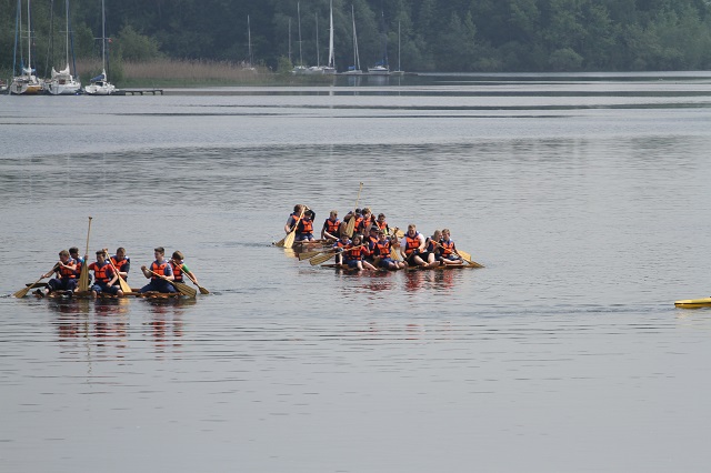 Nachdem die Flöße montiert und auf Schwimmtauglichkeit getestet waren, folgte auch hier eine Sicherheitseinweisung. Dann wurde es Ernst: Die Flöße wurden zu Wasser gelassen und nach ein paar Runden mit den mehr oder weniger schwimmtauglichen „Booten“, trafen auch die Teams der Kanuten am Ufer ein.