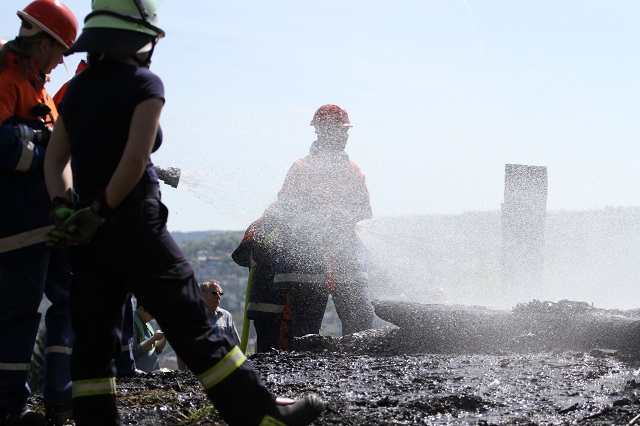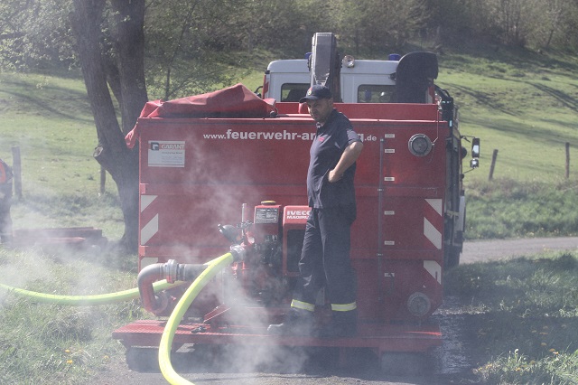 Peter Hansknecht (Osterfeuerausschussvorsitzender des Heimatbundes) fördert gerne die Jugendarbeit in der Arnsberger Feuerwehr, für den Heimatbund hat die Übung zusätzlich den Vorteil, dass auch die restlichen Glutnester des Osterfeuers gelöscht werden.