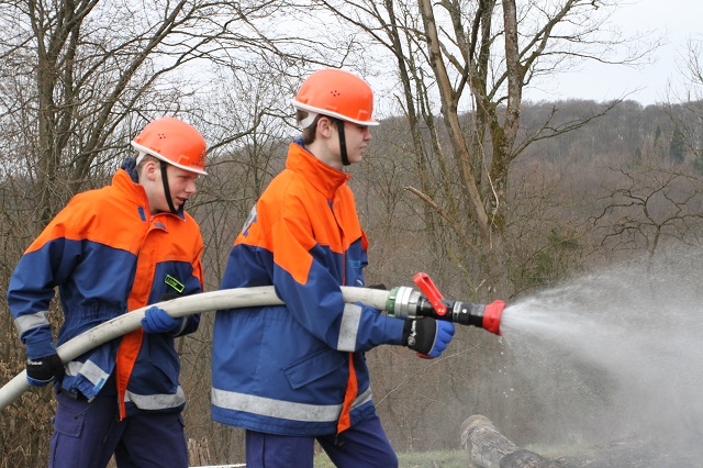 Parallel hierzu, bauten die restlichen Jugendlichen auf der Osterfeuerwiese den Löschangriff nach genaue so auf, wie sie es zuvor erlernt hatten. Nachdem alles aufgebaut und angeschlossen war, konnte auch sogleich mit dem Löschen begonnen werden. Die Jugendfeuerwehr rückte dem noch recht großen Osterfeuer mit 3 C – Strahlrohren zu Leibe und es stellt sich nach kurzer Zeit ein erster Löscherfolg ein. Um auch die letzten Glutnester abzulöschen, wurde anschließend das Feuer noch mit Haken auseinander gezogen, bis schließlich gemeldet werden konnte „Feuer aus“. Nach ca. 2 Stunden, war der Einsatz für den Nachwuchs abgearbeitet, und die Gerätschaften wieder verstaut.