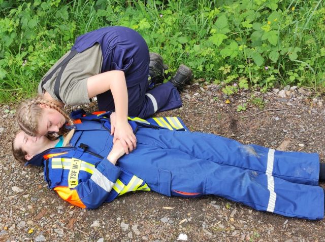 Ein besonderes Highlight des Abends war eine groß angelegte Personensuche bei Dunkelheit auf der Rüdenburg. Drei vermisste Personen mussten gefunden und in Sicherheit gebracht werden. Eine bewusstlose Person erforderte das direkte Anwenden von Erste-Hilfe-Maßnahmen – Kenntnisse, die am Nachmittag zuvor in einer theoretischen Einheit frisch vermittelt worden waren.