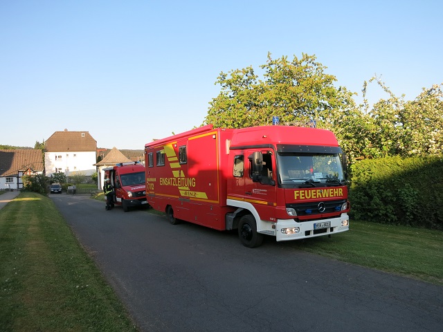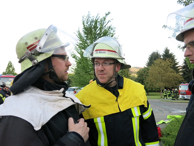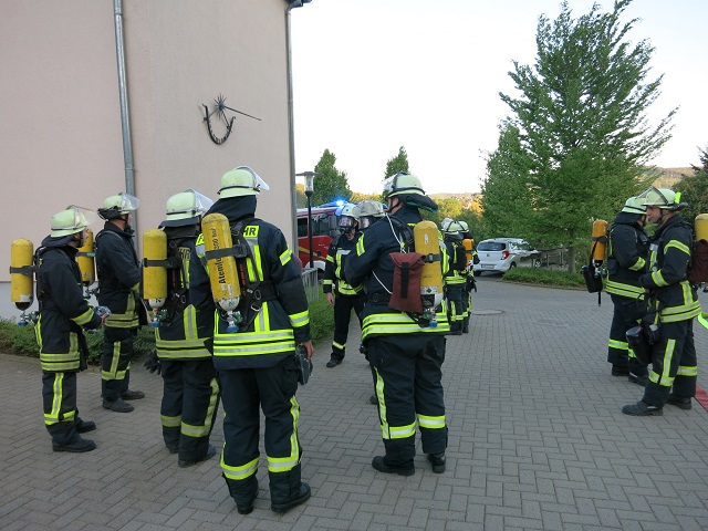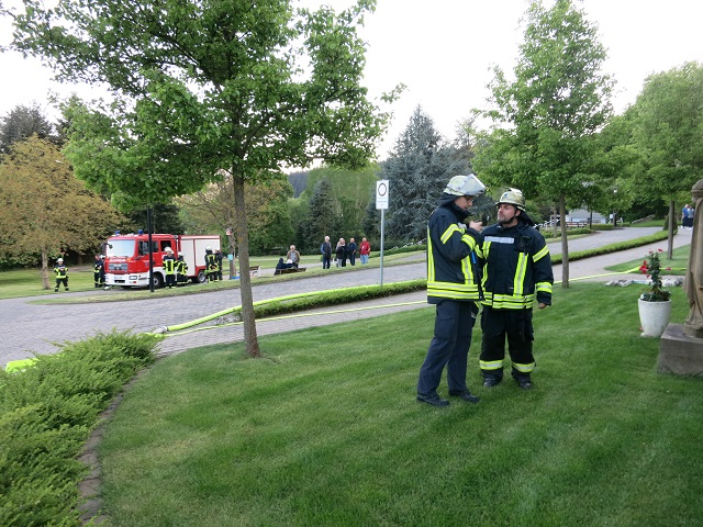 Oeventrop - Am Freitag dem 04.05. fand die Jahresübung des Basislöschzuges 2 (Arnsberg, Breitenbruch, Wennigloh) und Basislöschzuges 3 (Oeventrop, Rumbeck) statt. Gegen 19:00 erhielten die Einheiten die Information, dass im Altenpflegeheim Elisabethheim in Oeventrop die Brandmeldeanlage ausgelöst hat. Nach Erkundung der ersten Einsatzkräfte des Löschzuges Oeventrop konnte ein Brandereignis mit starker Rauchentwicklung im dritten Obergeschoss festgestellt werden, seitens des Betreuungspersonals wurde mitgeteilt, dass sich in dem betroffenen Bereich noch zehn Personen befinden. Hieraufhin erhöhte der Oeventroper Löschzugführer Oliver Pietz das Alarmstichwort, was zu einer Anfahrt der weiteren Übungsteilnehmer führte, zusätzlich wurde der Fernmeldedienst der Feuerwehr Arnsberg alarmiert um den Einsatzleiter bei der zu erwartenden ausgedehnten Einsatzlage zu unterstützen.