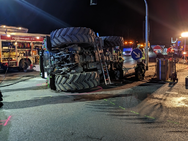 Die ebenfalls an die Unfallstelle gerufenen Abschleppdienste nahmen im weiteren Verlauf die Bergung der verunfallten Fahrzeuge vor. Die Feuerwehr begleitete diese Bergung und stellte im gesamten Einsatzzeitrum den Brandschutz sicher. Des Weiteren konnte nach dem Aufrichten des Treckers noch eine größere Menge an Kraftstoff abgestreut werden.
