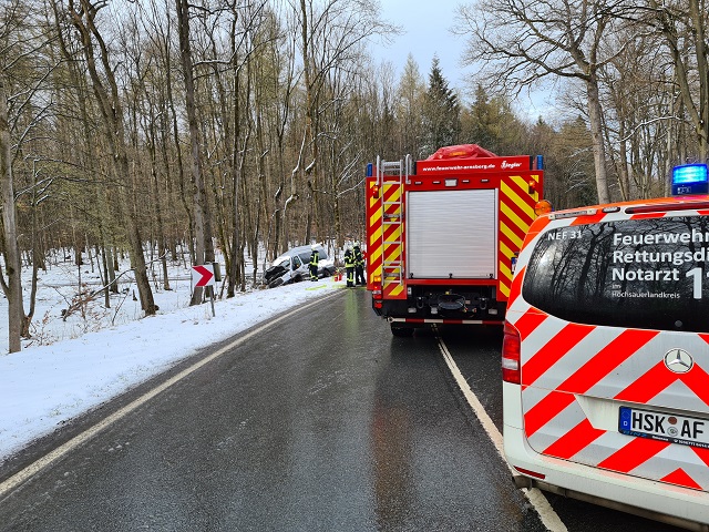 Am Dienstagnachmittag kam es auf der Landstraße zwischen Arnsberg und Breitenbruch zu einem PKW Unfall. Der Einsatz wurde der Leitstelle des HSK über ein Fahrzeug-Notruf-System gemeldet. Dieses System erkennt den Aufprall und sendet den Standort und eine Einschätzung der Schwere des Unfalls. Hieraufhin wurden die hauptamtlichen Kräfte aus Arnsberg, der Löschzug Arnsberg und der Rettungsdienst mit dem Stichwort PKW Unfall mit eingeklemmter Person alarmiert. Vor Ort stellte sich heraus das es zu einer Kollision zwischen einem Kleinbus und einem PKW gekommen ist. Insgesamt wurden 4 Personen vom Rettungsdienst betreut und in umliegende Krankenhäuser gebracht, eingeklemmt oder schwer verletzt war keiner. Die Feuerwehr hielt einen Löschangriff zur Vorsicht bereit und sicherte die Einsatzstelle, die Kameraden des Löschzuges Arnsberg konnten die Anfahrt abbrechen.