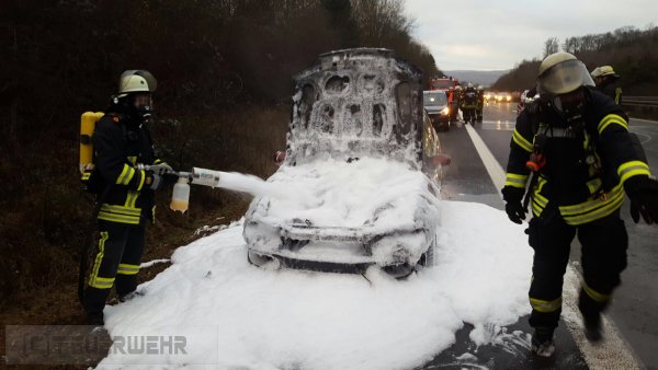 Am Dienstagnachmittag (15.39 Uhr) wurde die Feuerwehr Arnsberg zu einem brennenden Pkw auf der BAB 46 in Fahrtrichtung Meschede gerufen. Zwischen den Anschlussstellen Hüsten und Arnsberg-Altstadt rückten Kräfte der Hauptwachen Neheim und Arnsberg sowie vom Löschzug Hüsten aus. Beim Eintreffen der Wehr brannte es bereits im Motorraum des Fahrzeuges. Ein Trupp unter Atemschutz rückte dem Feuer mit einem Schnellangriff zuleibe. Nachdem die Flammen abgelöscht waren, wurden der Motorraum sowie der Innenraum des Kombis komplett eingeschäumt.