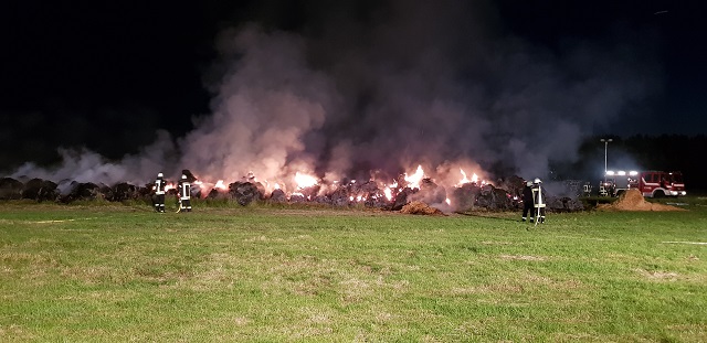 Am Freitagabend gegen 19.30 Uhr wurde die Feuerwehr zu einem Brandeinsatz auf dem Flammberg alarmiert. Beim Eintreffen der ersten Einsatzkräfte standen rund 300 Strohballen bereits im Vollbrand. Sofort wurde ein massiver Löschangriff vorgenommen. Um ausreichen Löschwasser vor Ort zu haben, wurden weitere Feuerwehren aus dem Stadtgebiet mit Tanklöschfahrzeugen und der Abrollbehälter-Wasser (dieser fasst ca. 11.000 Liter) alarmiert um einen sogenannten Pendelverkehr einzurichten.